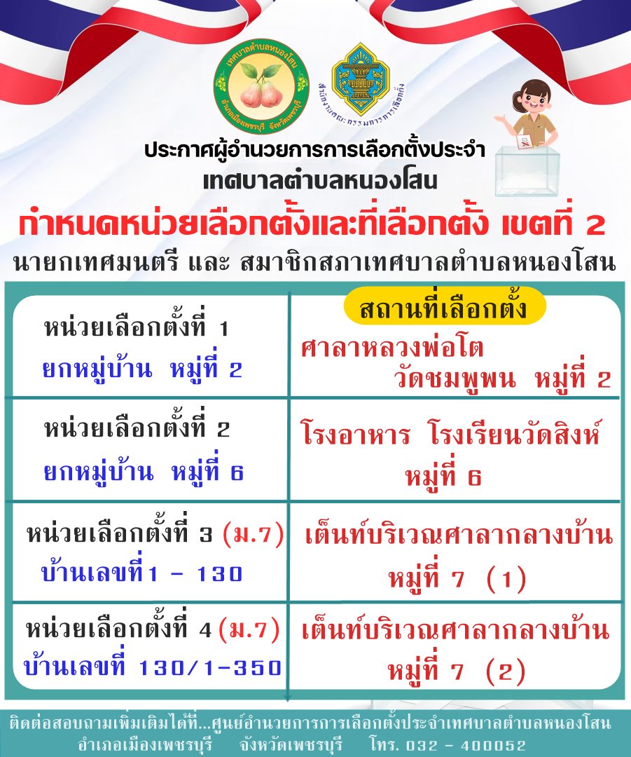 ► ติดต่อสอบถามเพิ่มเติมได้ที่ สำนักงานคณะกรรมการการเลือกตั้งประจำจังหวัดเพชรบุรี โทร. 032 - 473730 - 3 หรือบริการสายด่วน 1444 , ศูนย์อำนวยการการเลือกตั้งประจำเทศบาลตำบลหนองโสน อำเภอเมืองเพชรบุรี จังหวัดเพชรบุรี โทร.032 - 400052