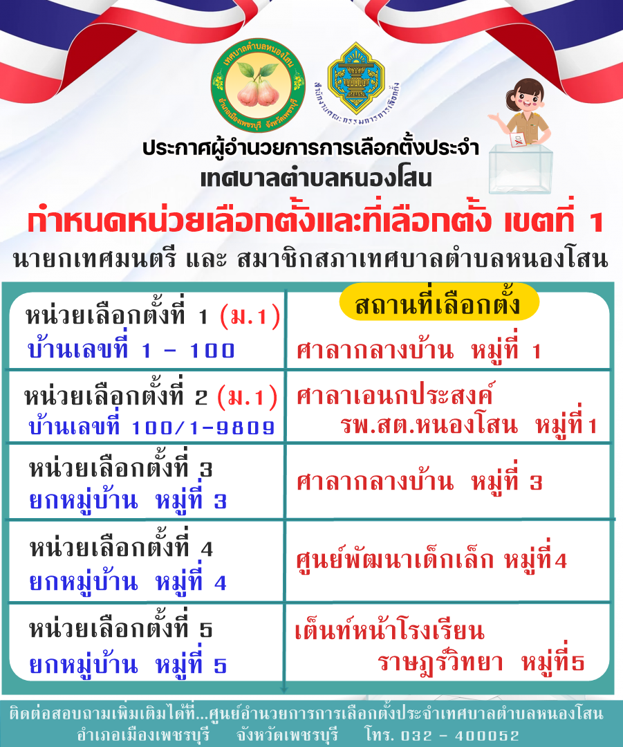 ► ติดต่อสอบถามเพิ่มเติมได้ที่ สำนักงานคณะกรรมการการเลือกตั้งประจำจังหวัดเพชรบุรี โทร. 032 - 473730 - 3 หรือบริการสายด่วน 1444 , ศูนย์อำนวยการการเลือกตั้งประจำเทศบาลตำบลหนองโสน อำเภอเมืองเพชรบุรี จังหวัดเพชรบุรี โทร.032 - 400052