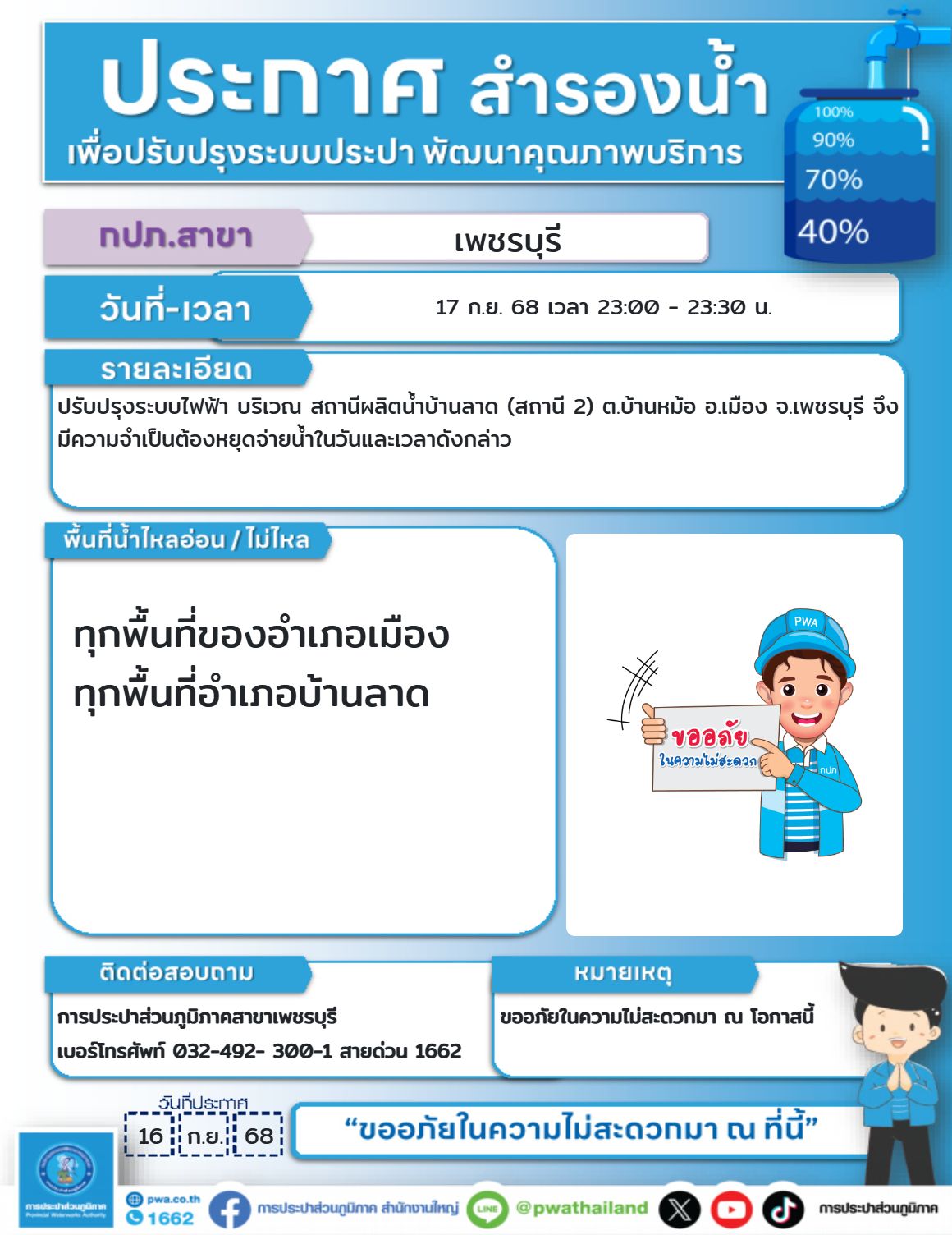 ► การประปาหยุดจ่ายน้ำประปาชั่วคราว ในวันที่ 17 กันยายน 2568 ตั้งแต่เวลา 23.00 น. - 23.30 น. เพื่อปรับปรุงระบบไฟฟ้า บริเวณสถานีผลิตน้ำบ้านลาด (สถานี 2 ) ต.บ้านหม้อ อเมือง จ.เพชรบุรี จึงมีความจำเป็นต้องหยุดจ่ายน้ำ ชั่วคราว ทุกพื้นที่ของอำเภอเมือง และ ทุกพื้นที่ของอำเภอบ้านลาด ♦ จึงขอให้พี่น้อง ประชาชนตำบลหนองโสนและพื้นที่ใกล้เคียง ได้สำรองกักเก็บน้ำไว้ใช้ให้เพียงพอในช่วงเวลาดังกล่าว ????️ คาดว่าหลังเวลา 24.00 น. น้ำประปาก็จะเริ่มทยอยกลับมาใช้ได้ตามปกติ ♦ หากครัวเรือนใดน้ำประปายังไม่ไหล ขอให้แจ้งไปที่ การประปาส่วนภูมิภาคสาขาเพชรบุรีได้ ที่เบอร์โทร. 032 – 492300–– 1 หรือที่สายด่วน 1662 ได้ตลอด 24 ชั่วโมง